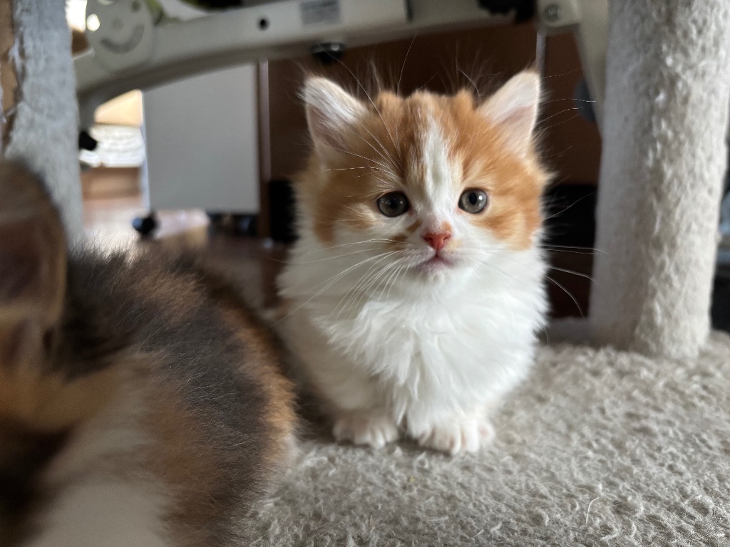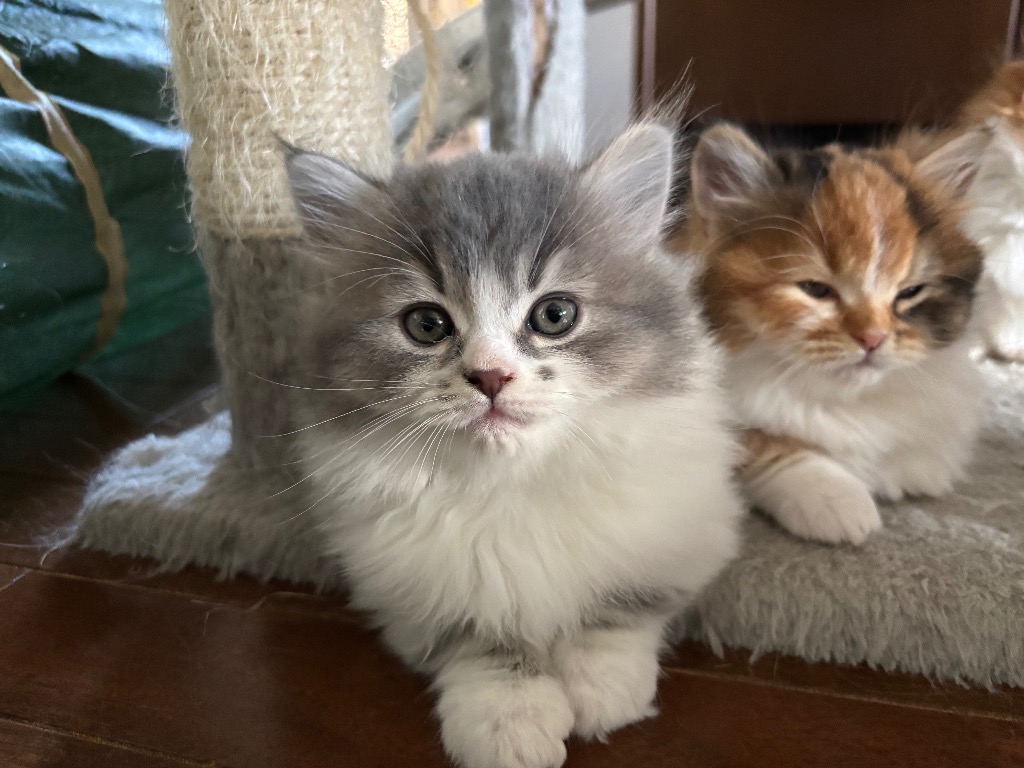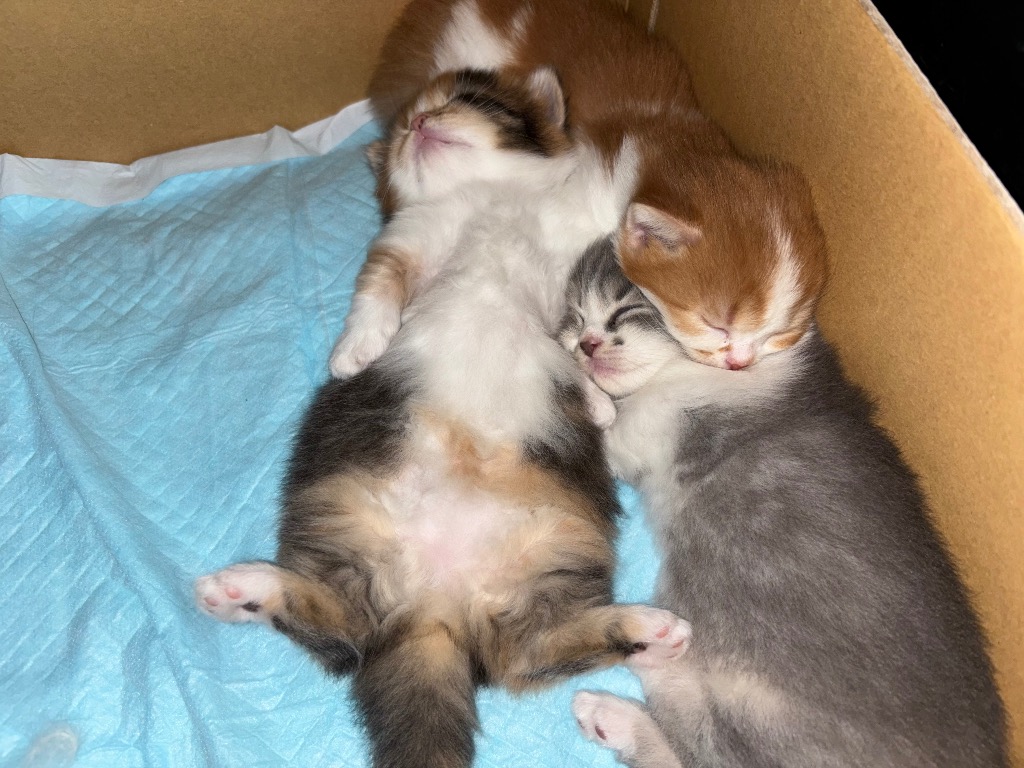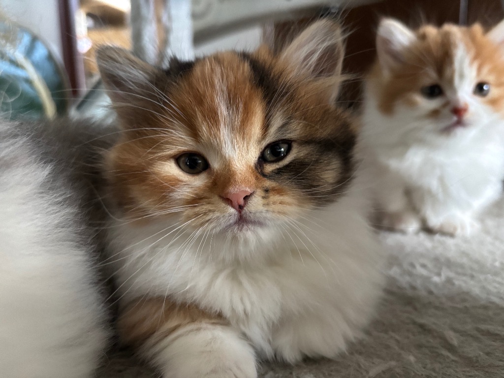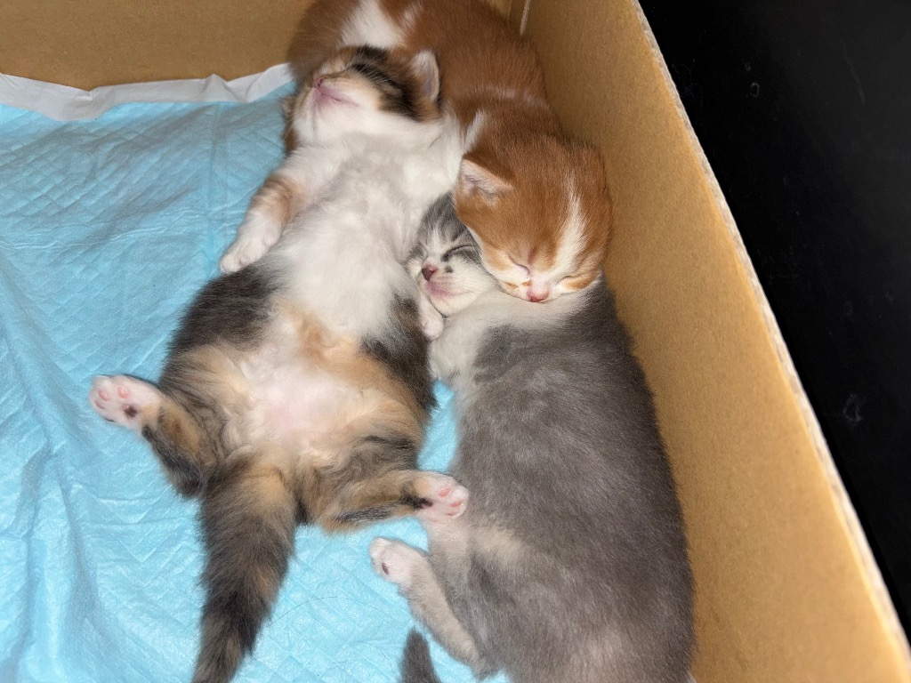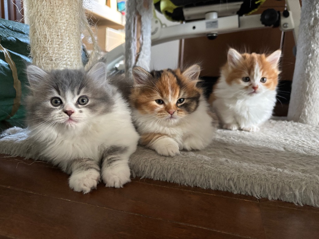 こんにちは。今日の郡山市は朝晩は寒いですけど、日中はポカポカ陽気で気持ちいいですね〜。マンチカンのアーニャさんの子達は3匹仲良しで、いつも一緒に遊んで寝ています。3匹ともふわふわモコモコで、ぬいぐるみみたいです💕キャリコちゃんはかなり眠たいようでした🤭