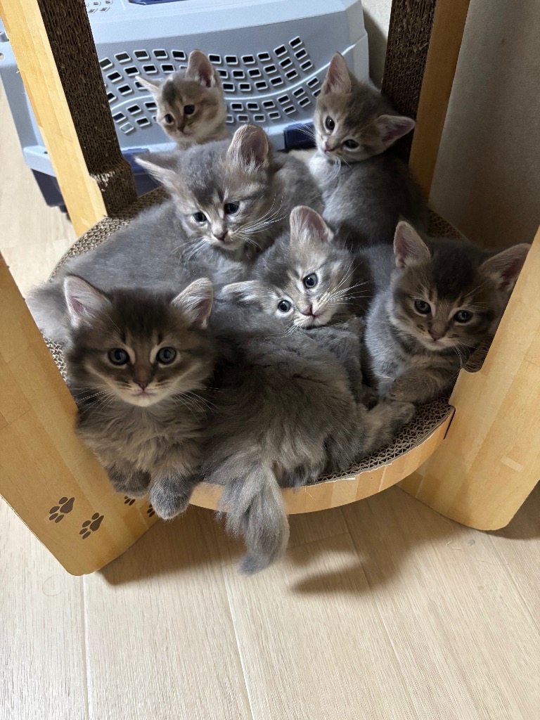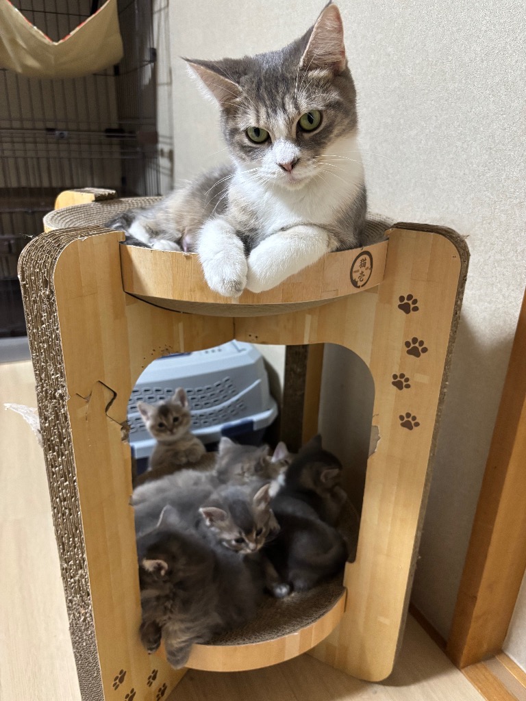 こんにちは。今日の郡山市は昨日までの暖かさとは違い、一気に冬の寒さになってしまいましたね〜。秋は一体どこにいってしまったのでしょうね💦さて、マンチカンのラムちゃんのお子達もすくすく育ち、毎日元気に過ごしております。お写真は2段の爪研ぎに親子でいるとっても可愛いお写真です。みんな同じ色だから、よ〜く見ないと何匹いるか分からないですよ🤭