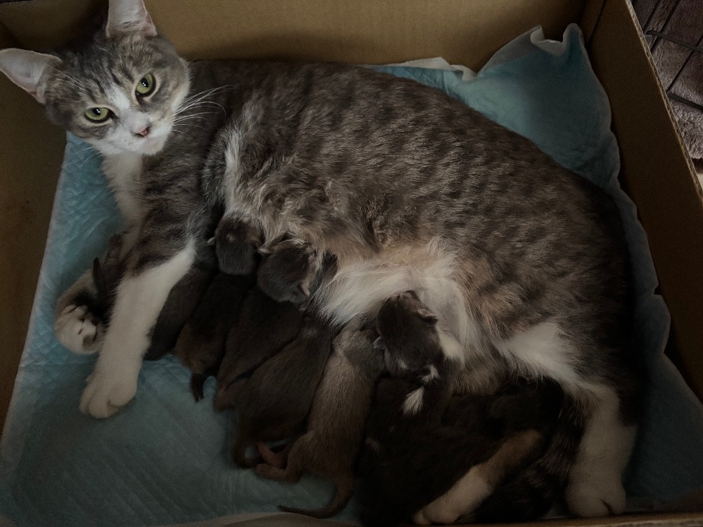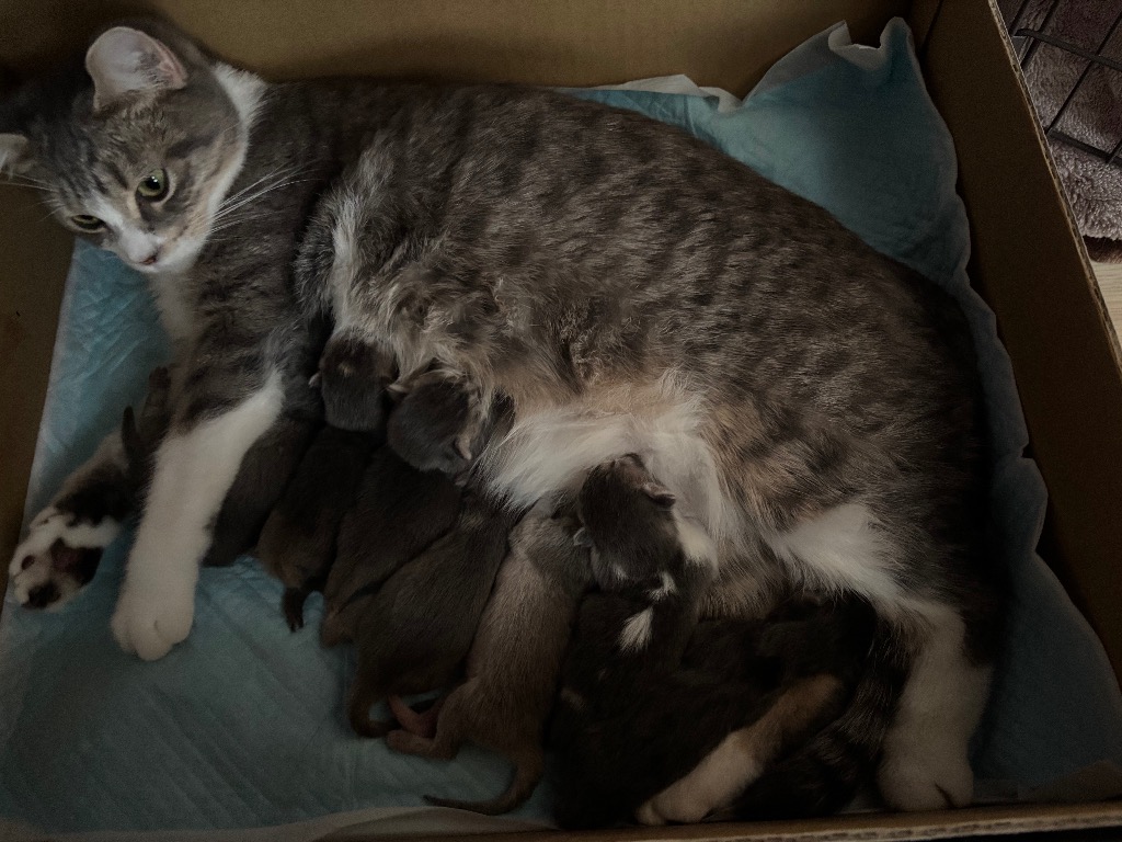 こんにちは。今日の郡山市は朝の寒さが嘘みたいに、日中ポカポカになり、また曇ってしまいましたね。寒暖の差が激しいので体調管理に気を付けましょうね😊さて、マンチカンのラムちゃんが無事出産しました。今回2回目ですが、なんと8匹の可愛い赤ちゃんが誕生しました〜💕みんなブルー系の色をしているので、見分けが付きづらそうです🤭今回もちゃんと私が立ち会えて、本当に良かったです🍀ラムちゃん、お疲れさまでした😊