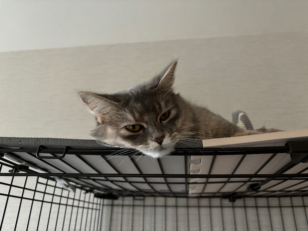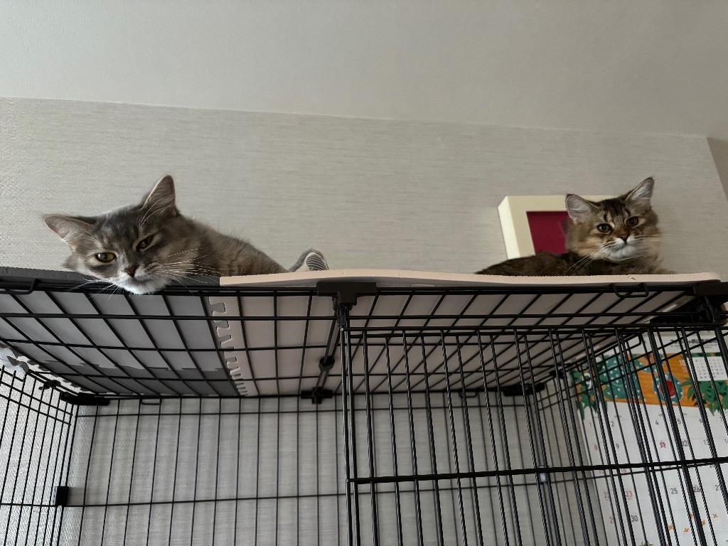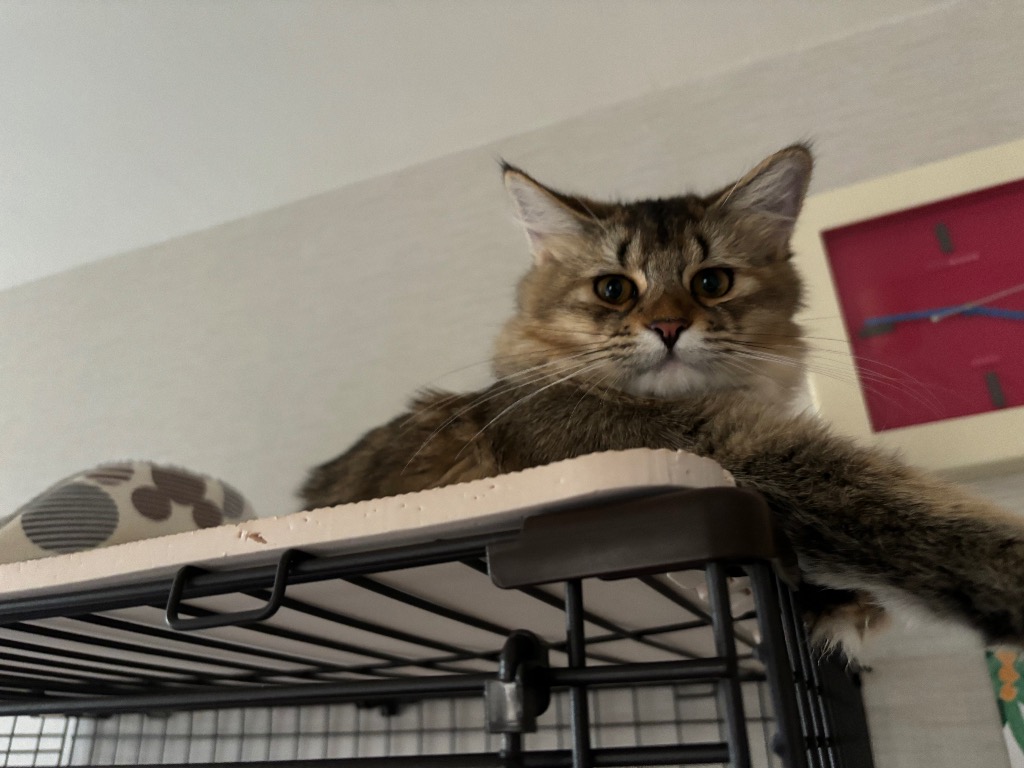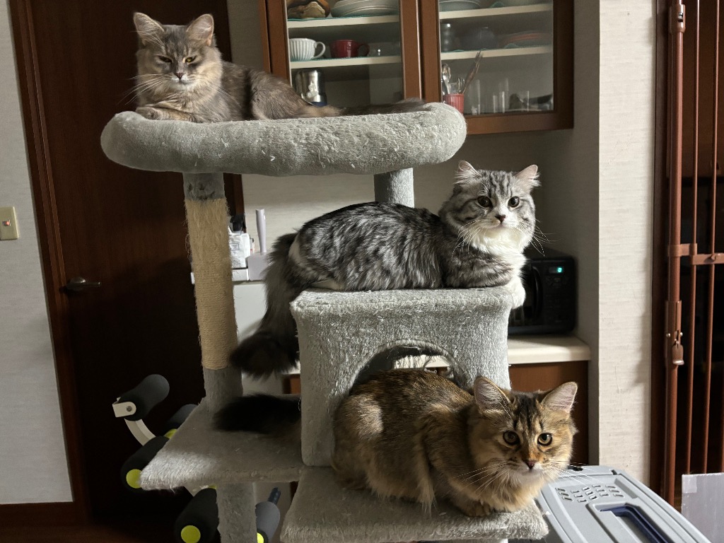 こんにちは。今日の郡山市はポカポカ陽気に包まれ、洗濯物もカラッと乾きますね😊さて、今日の1枚目はキャットタワーに3匹が揃った激レアショットです📷✨ネネとケンシロウとベルが年功序列で並んでいます。最近はみんな携帯向けるとすぐ動いちゃうので、なかなか良い写真が撮れないのが悩みです😅3段ケージの一番上でお昼寝してるネネとベルです。上から見下ろされています🤭